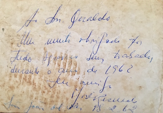 | No verso da foto: Ao Sr. Geraldo, Meu muito obrigado por tudo. Agradeço seu trabalho, durante o ano de 1962. Seu amigo, José Rezende - São João del-Rei, 18-2-62 |